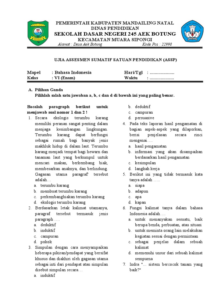 Bahasa Indonesia merupakan mata pelajaran penting yang membekali siswa dengan keterampilan berbahasa yang efektif. Memasuki semester 2 kelas 6, siswa diharapkan telah menguasai berbagai konsep dasar dan siap untuk menghadapi materi yang lebih kompleks. Artikel ini menyajikan bank soal Bahasa Indonesia kelas 6 semester 2 yang komprehensif, mencakup berbagai topik dan tipe soal, serta dilengkapi dengan pembahasan yang jelas. Tujuan utama dari bank soal ini adalah untuk membantu siswa mempersiapkan diri menghadapi ujian, meningkatkan pemahaman materi, dan mengasah kemampuan berpikir kritis.